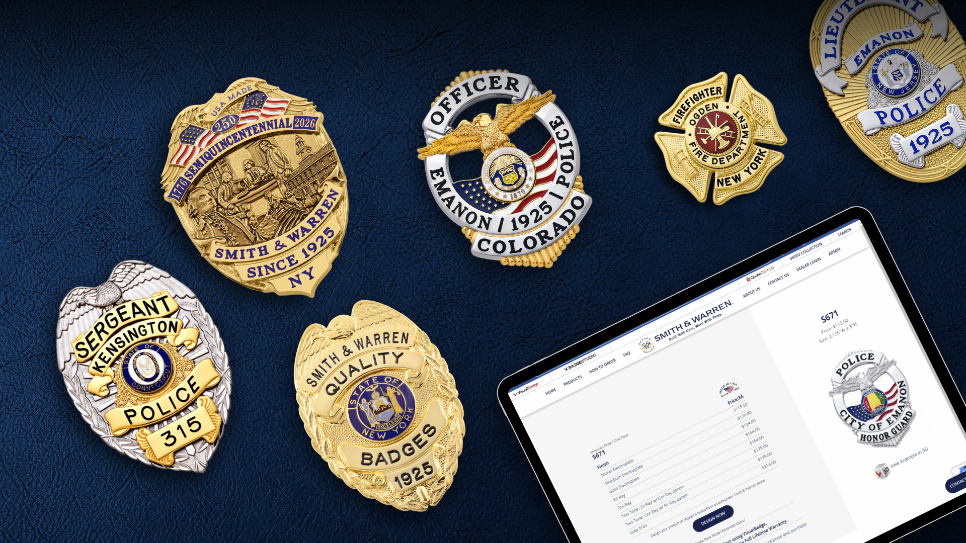 Smith & Warren produces the finest quality Police Badges, Fire Badges, EMS Badges, Sheriff Badges, and Military Badges. Since 1925, we have built a reputation for service and reliability by offering an extensive product line that includes high-quality uniform insignia, commendation bars, flexible badges, medals, and leather accessories.